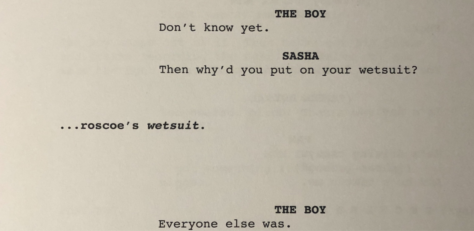 The question, which is first brought up on page 8 of the screenplay, is in reference to a tweet that comes across The Boy’s feed: “The Boy drops ‘roscoes wetsuit’ into Google… The answer to ‘what is roscoe’s wetsuit?’ is…’roscoe’s wetsuit’. Hilarious”.